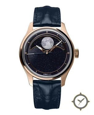 Eine Dress-Uhr mit einem vielseitigen 40mm Gehäuse, das an fast jedes Handgelenk passt, gefertigt aus Gold mit einem Zifferblatt in marineblau und einer besonderen "aventurine (sparkling/star-field)"-Oberfläche und einer wunderschönen Mondphasenanzeige.