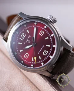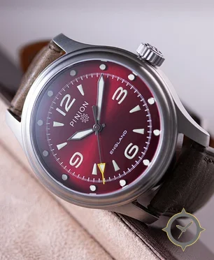 Eine Field-Uhr mit einem 37mm Gehäuse im Vintage-Stil gefertigt aus Edelstahl mit einem Zifferblatt in rot und einer besonderen "sunburst"-Oberfläche.