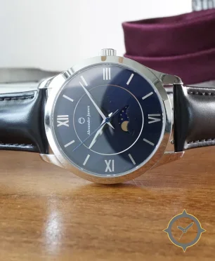 Eine Dress-Uhr mit einem 34mm Gehäuse im Vintage-Stil gefertigt aus Edelstahl mit einem Zifferblatt in marineblau und einer besonderen "matte"-Oberfläche und einer wunderschönen Mondphasenanzeige.
