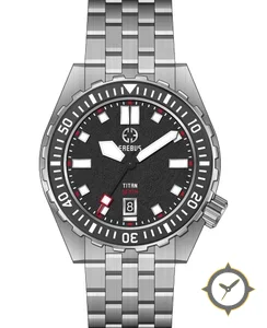 Eine Taucheruhr-Uhr mit einem markanten 51mm Auftritt am Handgelenk, gefertigt aus Edelstahl mit einem Zifferblatt in schwarz und einer besonderen "textured/grained"-Oberfläche.
