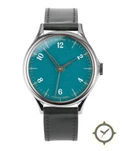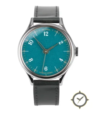Eine Dress-Uhr mit einem markanten 41.5mm Auftritt am Handgelenk, gefertigt aus Edelstahl mit einem Zifferblatt in türkis und einer besonderen "vitreous enamel (granular)"-Oberfläche.