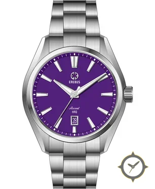 Eine Dress-Uhr mit einem markanten 48.5mm Auftritt am Handgelenk, gefertigt aus Edelstahl mit einem Zifferblatt in lila und einer besonderen "matte"-Oberfläche.