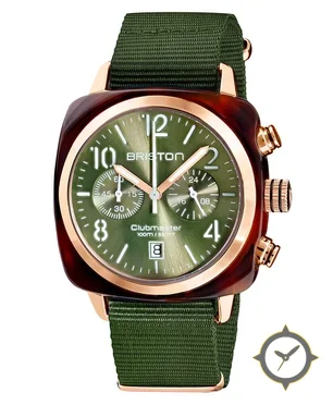 Eine Chronograph-Uhr mit einem markanten 46.5mm Auftritt am Handgelenk, gefertigt aus Harz mit einem Zifferblatt in grün und einer besonderen "sunburst"-Oberfläche.