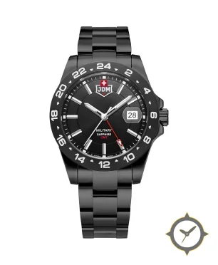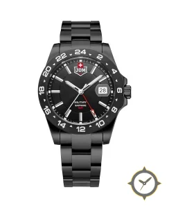 Eine Militär-Uhr mit einem markanten 54mm Auftritt am Handgelenk, gefertigt aus Edelstahl mit einem Zifferblatt in schwarz und einer besonderen "matte"-Oberfläche.