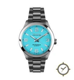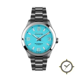 Eine Sport-Uhr mit einem 37mm Gehäuse im Vintage-Stil gefertigt aus Edelstahl mit einem Zifferblatt in türkis und einer besonderen "lacquer (gloss)"-Oberfläche.