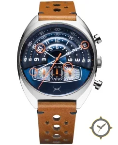 Eine Chronograph-Uhr mit einem 37.5mm Gehäuse im Vintage-Stil gefertigt aus Edelstahl mit einem Zifferblatt in blau und einer besonderen "sunburst"-Oberfläche.