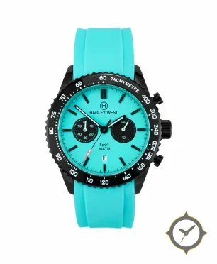 Eine Chronograph-Uhr mit einem markanten 49mm Auftritt am Handgelenk, gefertigt aus Edelstahl mit einem Zifferblatt in türkis und einer besonderen "lacquer"-Oberfläche.