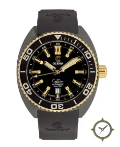 Eine Taucheruhr-Uhr mit einem 36mm Gehäuse im Vintage-Stil gefertigt aus Edelstahl mit einem Zifferblatt in schwarz und einer besonderen "lacquer"-Oberfläche.