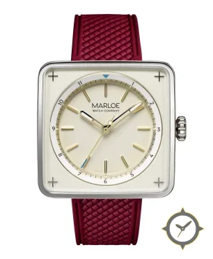 Eine Minimalistisch-Uhr mit einem 37.5mm Gehäuse im Vintage-Stil gefertigt aus Edelstahl mit einem Zifferblatt in weiß und einer besonderen "textured guilloche outer ring with smooth central dial"-Oberfläche.