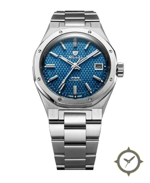 Eine Luxus-Uhr mit einem markanten 45mm Auftritt am Handgelenk, gefertigt aus Edelstahl mit einem Zifferblatt in blau und einer besonderen "tapisserie/waffle"-Oberfläche.
