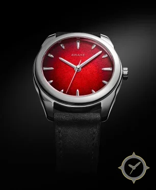 Eine Dress-Uhr mit einem markanten 44mm Auftritt am Handgelenk, gefertigt aus Edelstahl mit einem Zifferblatt in rot und einer besonderen "textured metallic / granular sunburst finish"-Oberfläche.
