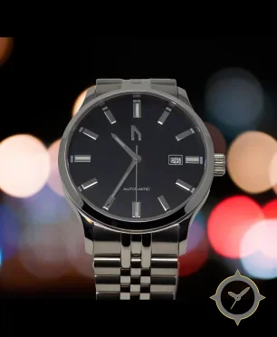 Eine Dress-Uhr gefertigt aus Edelstahl mit einem Zifferblatt in schwarz und einer besonderen "matte"-Oberfläche.
