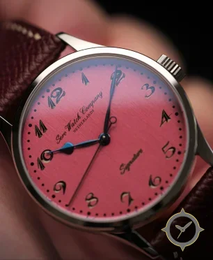 Eine Dress-Uhr mit einem markanten 43.5mm Auftritt am Handgelenk, gefertigt aus Edelstahl mit einem Zifferblatt in rot und einer besonderen "brushed"-Oberfläche.