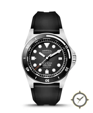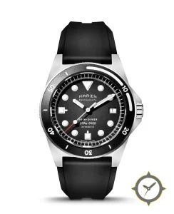 Eine Taucheruhr-Uhr mit einem vielseitigen 40mm Gehäuse, das an fast jedes Handgelenk passt, gefertigt aus Edelstahl mit einem Zifferblatt in schwarz und einer besonderen "matte"-Oberfläche.