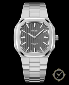 Eine Luxus-Uhr mit einem vielseitigen 40.5mm Gehäuse, das an fast jedes Handgelenk passt, gefertigt aus Edelstahl mit einem Zifferblatt in grau und einer besonderen "vertical fluted / brushed guilloché"-Oberfläche.