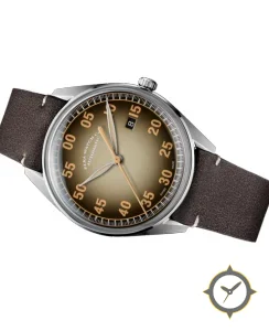 Eine Pilot-Uhr mit einem markanten 45.5mm Auftritt am Handgelenk, gefertigt aus Edelstahl mit einem Zifferblatt in braun und einer besonderen "fumé gradient (sunburst)"-Oberfläche.