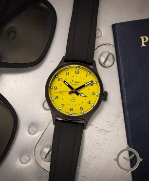 Eine Pilot-Uhr mit einem markanten 46.5mm Auftritt am Handgelenk, gefertigt aus Edelstahl mit einem Zifferblatt in gelb und einer besonderen "matte"-Oberfläche.