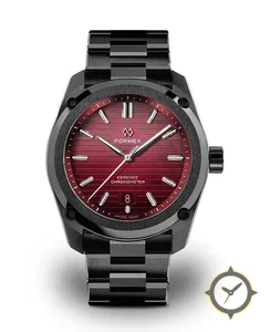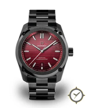 Eine Sport-Uhr mit einem markanten 42mm Auftritt am Handgelenk, gefertigt aus Edelstahl mit einem Zifferblatt in rot und einer besonderen "horizontal ridged / grooved texture with gradient"-Oberfläche.