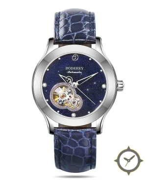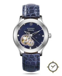 Eine Dress-Uhr mit einem markanten 42mm Auftritt am Handgelenk, gefertigt aus Edelstahl mit einem Zifferblatt in marineblau und einer besonderen "sparkling/aventurine (starry) finish"-Oberfläche.