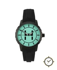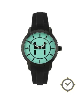 Eine Minimalistisch-Uhr mit einem 34.5mm Gehäuse im Vintage-Stil gefertigt aus Edelstahl mit einem Zifferblatt in türkis und einer besonderen "matte"-Oberfläche.