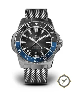 Eine GMT-Uhr mit einem markanten 43mm Auftritt am Handgelenk, gefertigt aus Edelstahl mit einem Zifferblatt in schwarz und einer besonderen "sunburst/gradient"-Oberfläche und einer echten GMT-Funktion, mit der du eine zweite Zeitzone verfolgen kannst.
