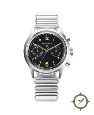Eine Chronograph-Uhr mit einem markanten 45.5mm Auftritt am Handgelenk, gefertigt aus Edelstahl mit einem Zifferblatt in schwarz und einer besonderen "matte grained"-Oberfläche.
