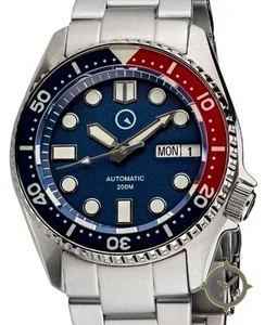 Eine Taucheruhr-Uhr mit einem vielseitigen 40mm Gehäuse, das an fast jedes Handgelenk passt, gefertigt aus Edelstahl mit einem Zifferblatt in blau und einer besonderen "sunburst"-Oberfläche.