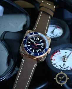 Eine Taucheruhr-Uhr mit einem markanten 45mm Auftritt am Handgelenk, gefertigt aus Bronze mit einem Zifferblatt in blau und einer besonderen "sunburst"-Oberfläche.