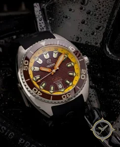 Eine Taucheruhr-Uhr mit einem markanten 41.5mm Auftritt am Handgelenk, gefertigt aus Edelstahl mit einem Zifferblatt in braun und einer besonderen "textured waffle / honeycomb"-Oberfläche.