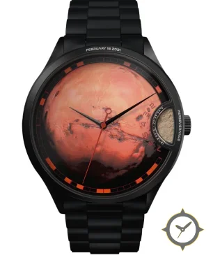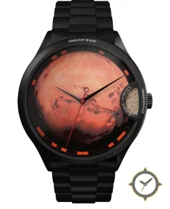 Eine Minimalistisch-Uhr mit einem markanten 47.5mm Auftritt am Handgelenk, gefertigt aus Edelstahl mit einem Zifferblatt in orange und einer besonderen "printed photographic image of Mars (matte/printed dial)"-Oberfläche.