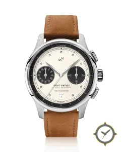 Eine Chronograph-Uhr mit einem 34.5mm Gehäuse im Vintage-Stil gefertigt aus Edelstahl mit einem Zifferblatt in weiß und einer besonderen "matte lacquer"-Oberfläche.