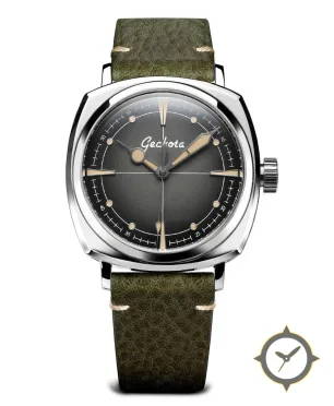 Eine Vintage-Uhr mit einem vielseitigen 39.5mm Gehäuse, das an fast jedes Handgelenk passt, gefertigt aus Edelstahl mit einem Zifferblatt in grau und einer besonderen "fumé gradient"-Oberfläche.