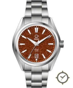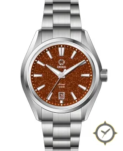 Eine Luxus-Uhr mit einem vielseitigen 40mm Gehäuse, das an fast jedes Handgelenk passt, gefertigt aus Edelstahl mit einem Zifferblatt in braun und einer besonderen "sparkle"-Oberfläche.
