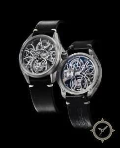 Eine Skelett-Uhr gefertigt aus Titan mit einem Zifferblatt in silber und einer besonderen "skeleton openworked with visible bridges and gears"-Oberfläche.