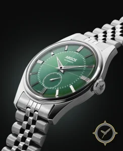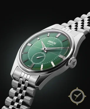 Eine Dress-Uhr mit einem vielseitigen 40mm Gehäuse, das an fast jedes Handgelenk passt, gefertigt aus Edelstahl mit einem Zifferblatt in grün und einer besonderen "sunburst center with textured/engraved outer chapter ring"-Oberfläche.