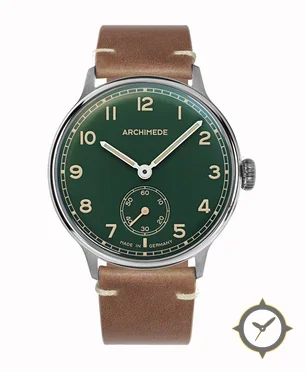 Eine Vintage-Uhr mit einem 34.5mm Gehäuse im Vintage-Stil gefertigt aus Edelstahl mit einem Zifferblatt in grün und einer besonderen "matte"-Oberfläche.