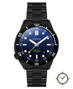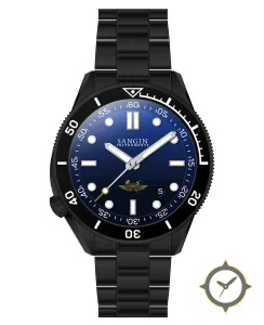 Eine Taucheruhr-Uhr mit einem 30.5mm Gehäuse im Vintage-Stil gefertigt aus Edelstahl mit einem Zifferblatt in blau und einer besonderen "sunburst gradient"-Oberfläche.