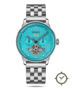 Eine Dress-Uhr mit einem 36mm Gehäuse im Vintage-Stil gefertigt aus Edelstahl mit einem Zifferblatt in türkis und einer besonderen "guilloché / clous de Paris patterned"-Oberfläche und einer echten GMT-Funktion, mit der du eine zweite Zeitzone verfolgen kannst.