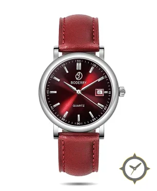 Eine Dress-Uhr mit einem 30.5mm Gehäuse im Vintage-Stil gefertigt aus Edelstahl mit einem Zifferblatt in karmesinrot und einer besonderen "sunburst / radial gradient"-Oberfläche.