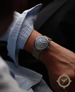 Eine Dress-Uhr mit einem markanten 45mm Auftritt am Handgelenk, gefertigt aus Edelstahl mit einem Zifferblatt in blau und einer besonderen "guilloché / textured"-Oberfläche.