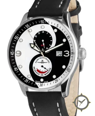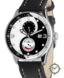 Eine Pilot-Uhr gefertigt aus Edelstahl mit einem Zifferblatt in schwarz und einer besonderen "matte two-tone (half black/half white)"-Oberfläche und einer praktischen Gangreserveanzeige.