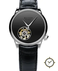 Eine Dress-Uhr mit einem vielseitigen 38mm Gehäuse, das an fast jedes Handgelenk passt, gefertigt aus Edelstahl mit einem Zifferblatt in schwarz und einer besonderen "high-gloss lacquer (surtout black enamel look)"-Oberfläche.
