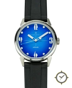Eine Sport-Uhr mit einem 35mm Gehäuse im Vintage-Stil gefertigt aus Edelstahl mit einem Zifferblatt in blau und einer besonderen "sunburst/gradient (fumé)"-Oberfläche.