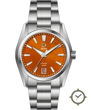 Eine Sport-Uhr mit einem 34mm Gehäuse im Vintage-Stil gefertigt aus Edelstahl mit einem Zifferblatt in orange und einer besonderen "sunburst"-Oberfläche.