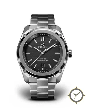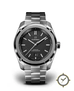 Eine Luxus-Uhr mit einem vielseitigen 41mm Gehäuse, das an fast jedes Handgelenk passt, gefertigt aus Edelstahl mit einem Zifferblatt in grau und einer besonderen "horizontal brushed / subtle grid texture"-Oberfläche.