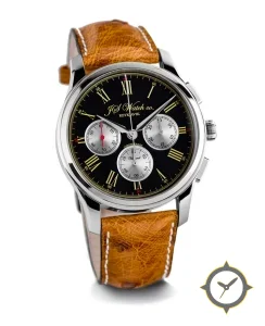 Eine Chronograph-Uhr mit einem markanten 43.5mm Auftritt am Handgelenk, gefertigt aus Edelstahl mit einem Zifferblatt in schwarz und einer besonderen "glossy"-Oberfläche.