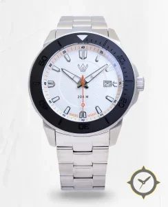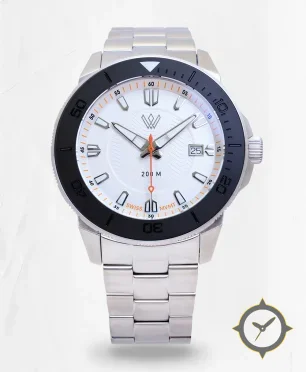 Eine Taucheruhr-Uhr mit einem markanten 49mm Auftritt am Handgelenk, gefertigt aus Edelstahl mit einem Zifferblatt in weiß und einer besonderen "subtle chevron / herringbone texture in center"-Oberfläche.