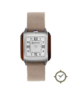 Eine Dress-Uhr mit einem 27.5mm Gehäuse im Vintage-Stil gefertigt aus Edelstahl mit einem Zifferblatt in weiß und einer besonderen "guilloche center with brushed outer flange"-Oberfläche.