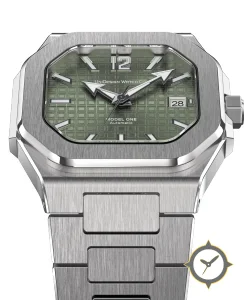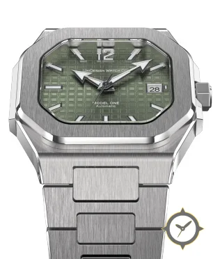 Eine Luxus-Uhr mit einem markanten 44mm Auftritt am Handgelenk, gefertigt aus Edelstahl mit einem Zifferblatt in grün und einer besonderen "waffle / tapisserie texture"-Oberfläche.