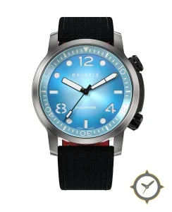 Eine Taucheruhr-Uhr mit einem 37mm Gehäuse im Vintage-Stil gefertigt aus Edelstahl mit einem Zifferblatt in blau und einer besonderen "sunburst / sunray finish"-Oberfläche.